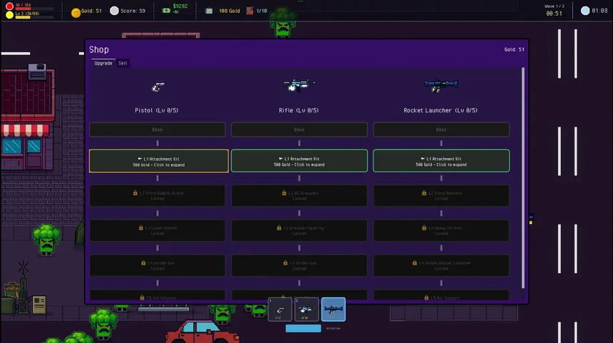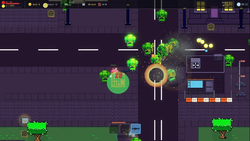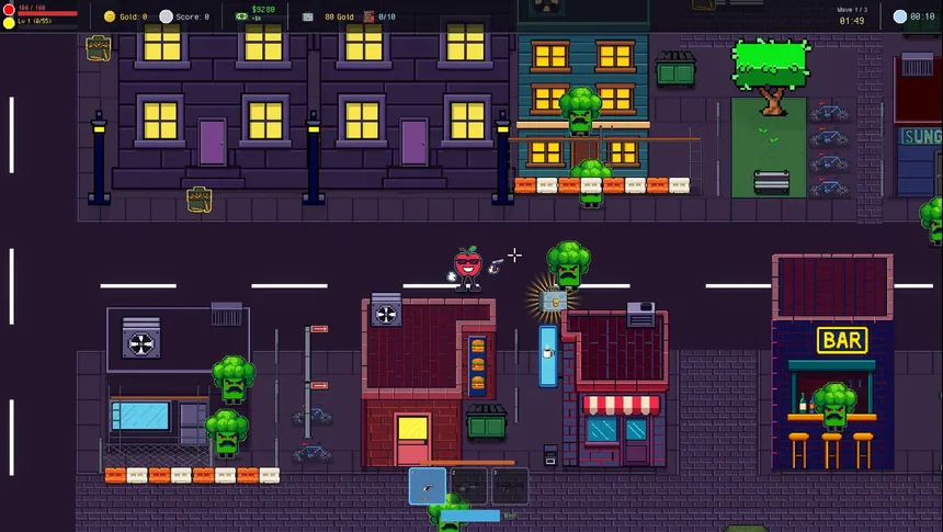 Apple Man Sam...is a little Apple Man! Shoot your way through hordes of moustached vegetables, as you level up, upgrade your weapons, and obtain items to grow absurdly strong. Defeat the final boss and complete quests to unlock more maps and loadouts, for endless fun!