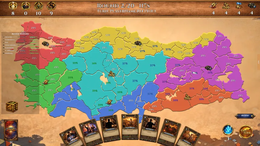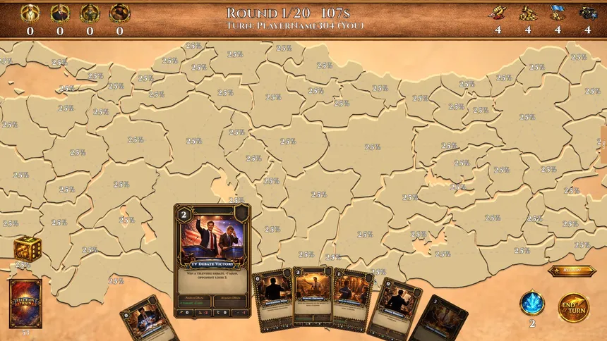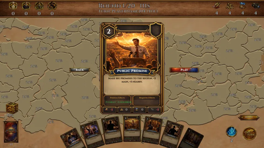 A turn-based strategy card game where up to 4 players compete for votes across real-world maps. Play cards, control cities, dominate regions, and outsmart your rivals to win the election. 7 maps, 4 unique parties, and dynamic disaster events.