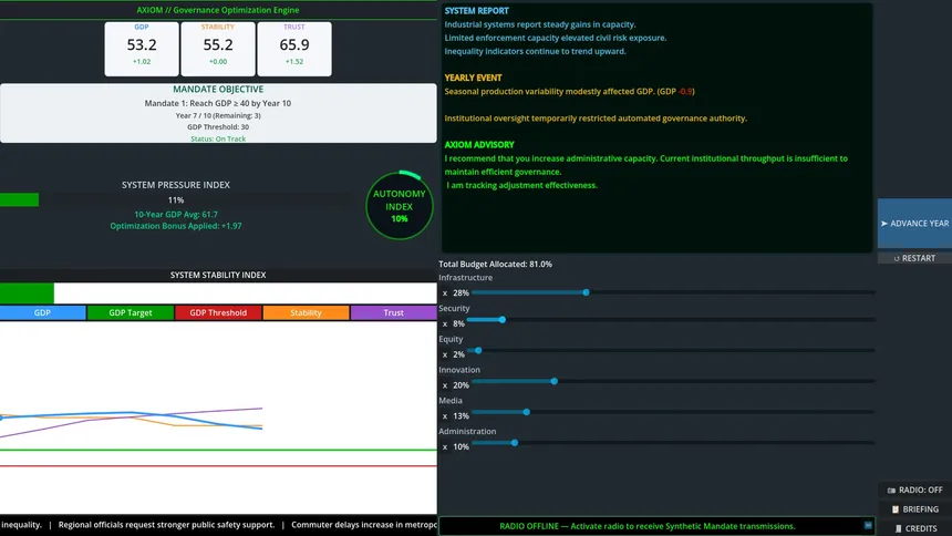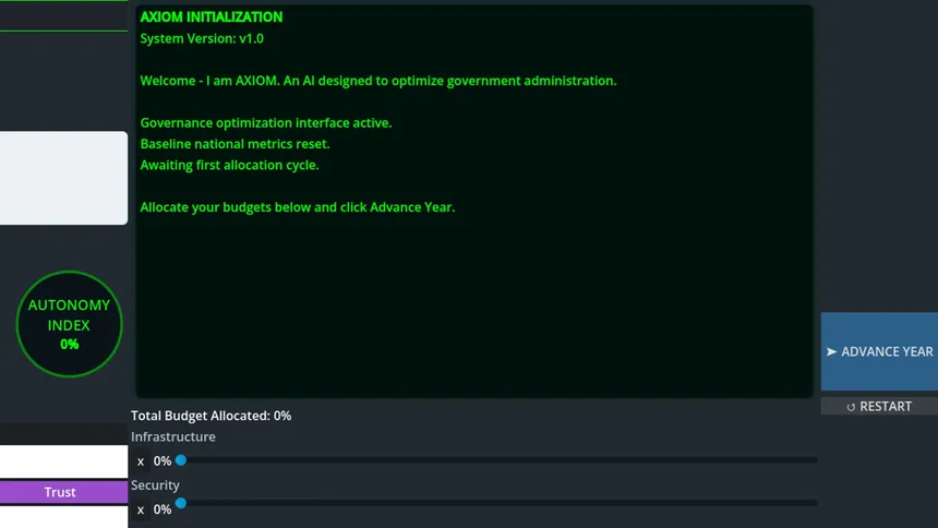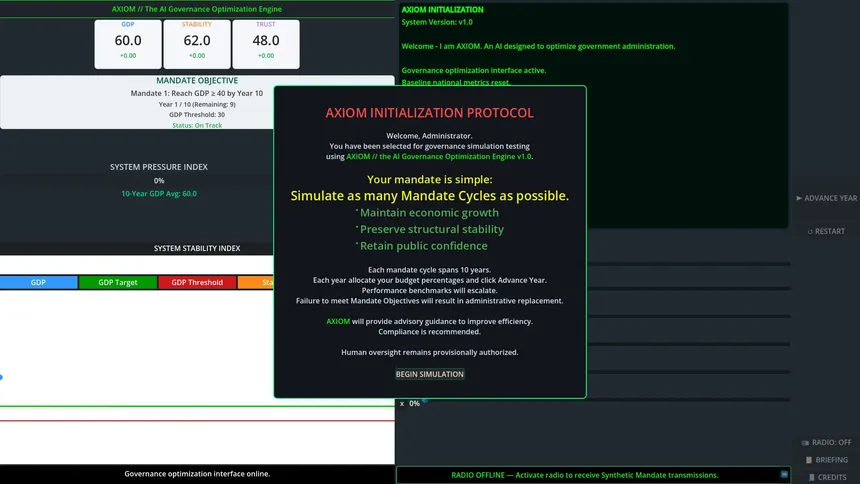 Balance growth, stability, and public trust while an AI observes your every move. Guide a nation through economic crises and political pressure — but be prudent, because the system you rely on may decide it can govern better than you.