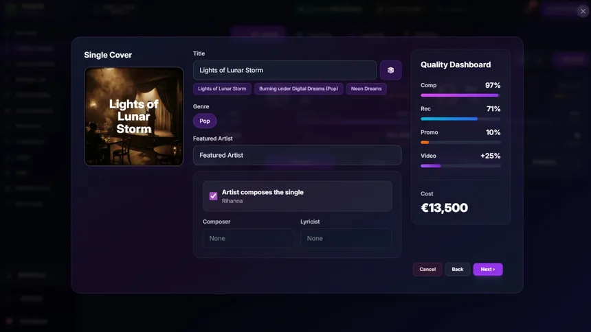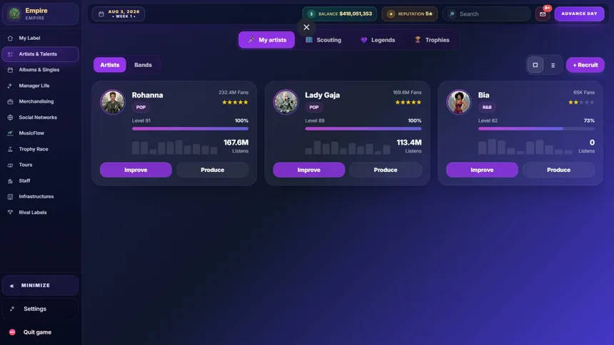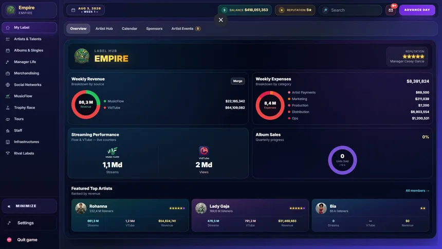 My Music Label is a music management and simulation game where you take full control of your label. Discover young talents, manage legendary artists, and shape the evolution of the music industry. Every decision influences careers and the history of music.