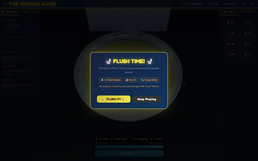 Step into a bizarre world where even taking a piss becomes a quest. Kill bugs, earn Piss-coins, upgrade, unlock hidden areas… and ultimately, flush.