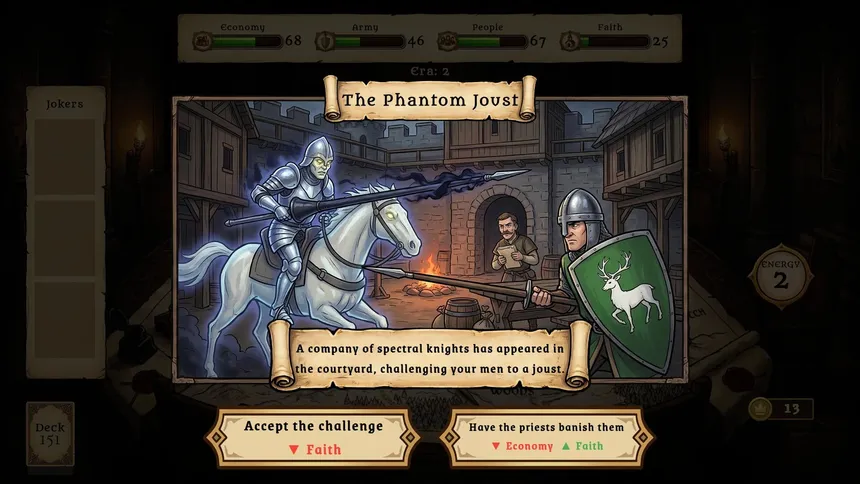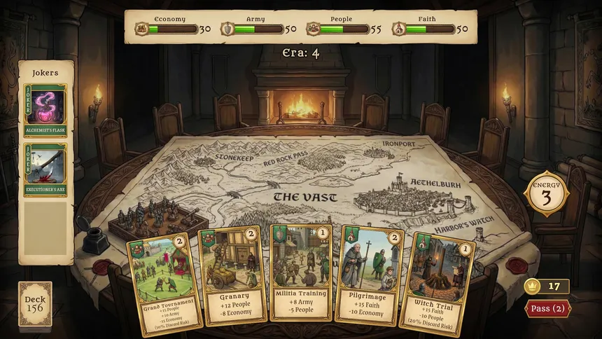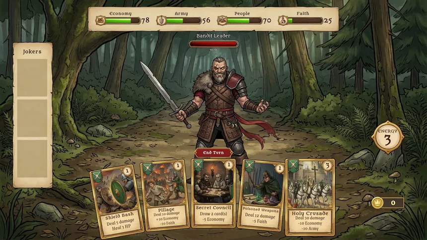 Возглавьте молодое королевство в хардкорном карточном рогалике. Пройдите через цепочку событий, используйте карты Королевства для выживания и сочетайте карты Боя с Джокерами. Здесь нет права на ошибку — каждое поражение окончательно. Соберите свою колоду и бросьте вызов судьбе.