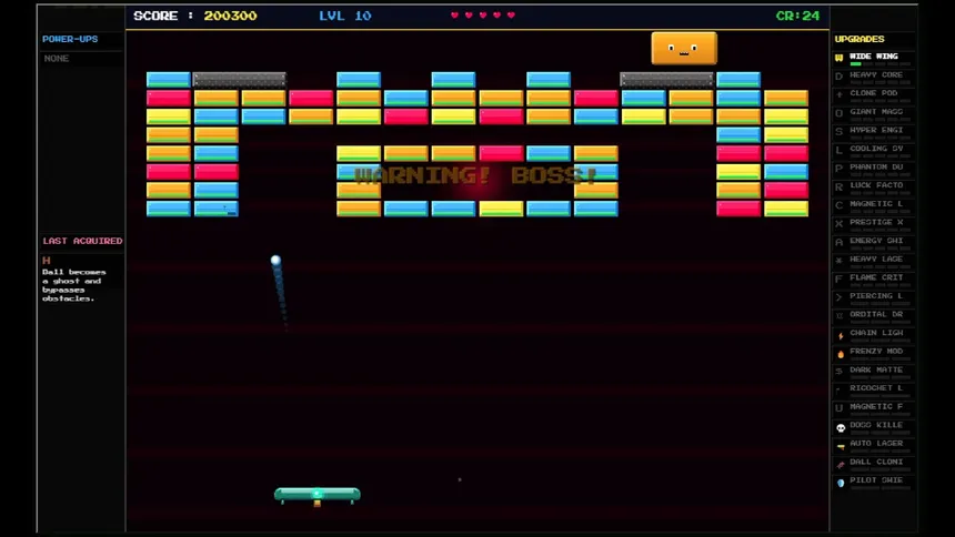 Классический Арканоид в жанре Roguelite! Пройдите 100 уровней, сражайтесь в кооператиve на двоих и улучшайте корабль навсегда. С более чем 30 картами способностей и эпическими боссами каждый забег уникален. Спасите галактику вместе с другом!