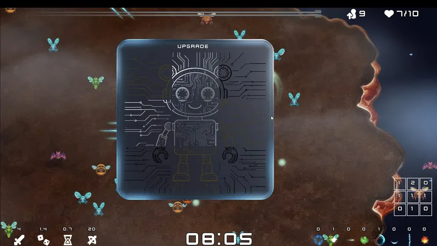 GridFall — это survivor-like с механикой сетки 3×3. На кибер-пустоши каждое повышение уровня предлагает выбрать одну из трёх случайных ячеек. Соберите линию, чтобы разблокировать активный навык. У каждой ячейки — своя пассивная особенность: выбирайте между вероятностью и силой.