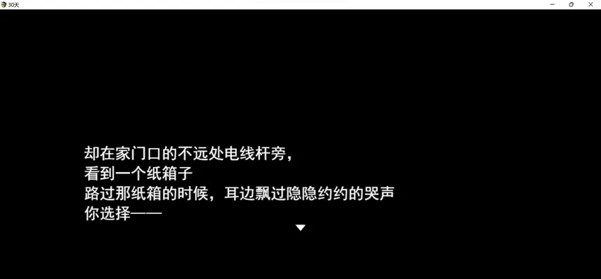 雪夜,你捡到一个女弃婴,30天后,对你来说,是又一个雪夜?还是新的开始? 《30天》是一部纯文字视觉小说,没有CG,没有配音配乐,只有文字和选择,旨在尝试gal圈新的风格,在此立誓,未来不会和国G切割。