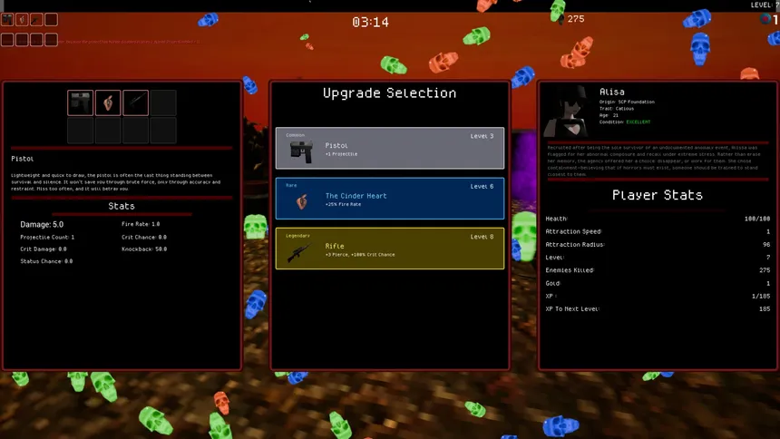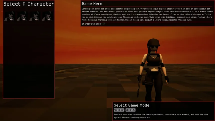 A fast-paced 3D paranormal horde survival roguelite. Choose your field operative, survive wave after wave of escalating anomalies, build a devastating mid-run loadout from randomized upgrades and pray ten minutes is long enough.