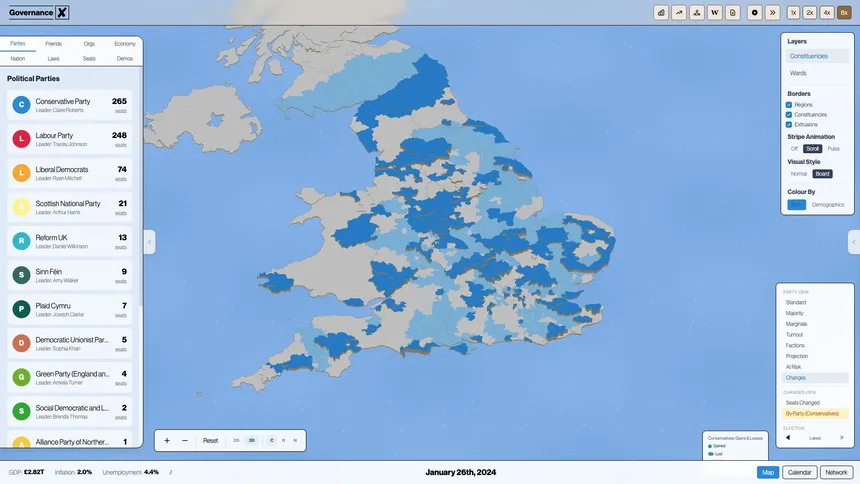 Governance — игра от компании Woy Woy Games, разработанная для платформы PC. Проект совмещает в себе такие жанры и элементы, как симулятор. Дополнительно игроки выделяют такие особенности игры, как симулятор, симулятор бога, политический симулятор и 2d. Игра рассчитана на одиночное прохождение, многопользовательские режимы не предусмотрены.
