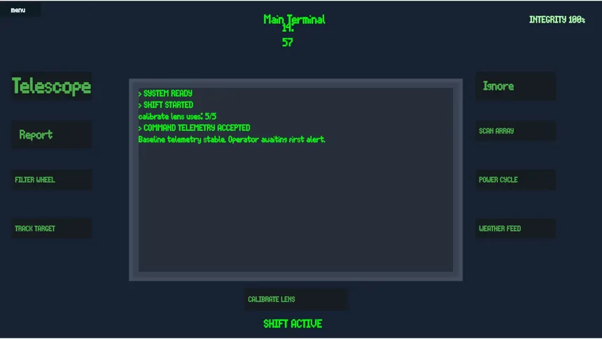 Operate a remote deep-space observatory terminal, monitor incoming alerts, and investigate strange cosmic anomalies. Maintain system integrity, decide which alerts to trust, and document the impossible before your shift ends.