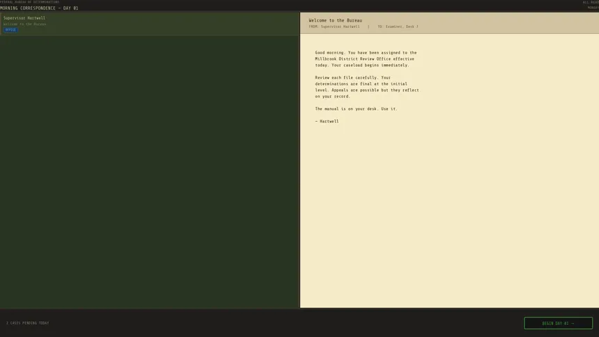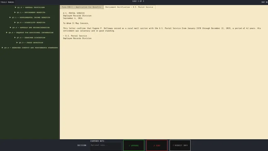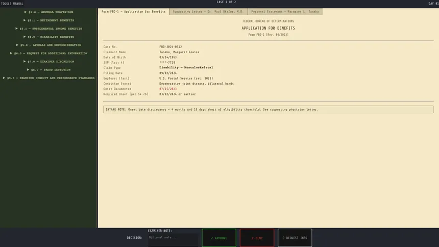 A narrative desk simulation about bureaucracy and the people behind it. Ten days. Dozens of cases. Claimants file for benefits, you read the file, check the manual, and stamp the folder. Approve. Deny. Request more information. Your record will reflect your decisions