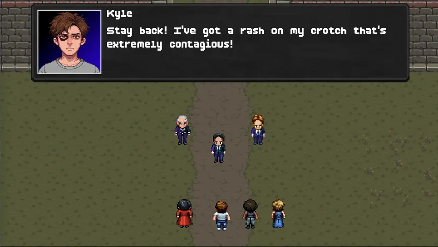 A new modern, turn-based pixel RPG by Rust Games! Silly tone, serious quest. Set in a dystopian America, the party must overthrow evil feudal lords called the Quorum while managing Kyle's worst impulses.
