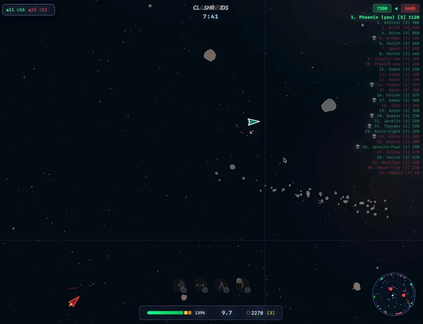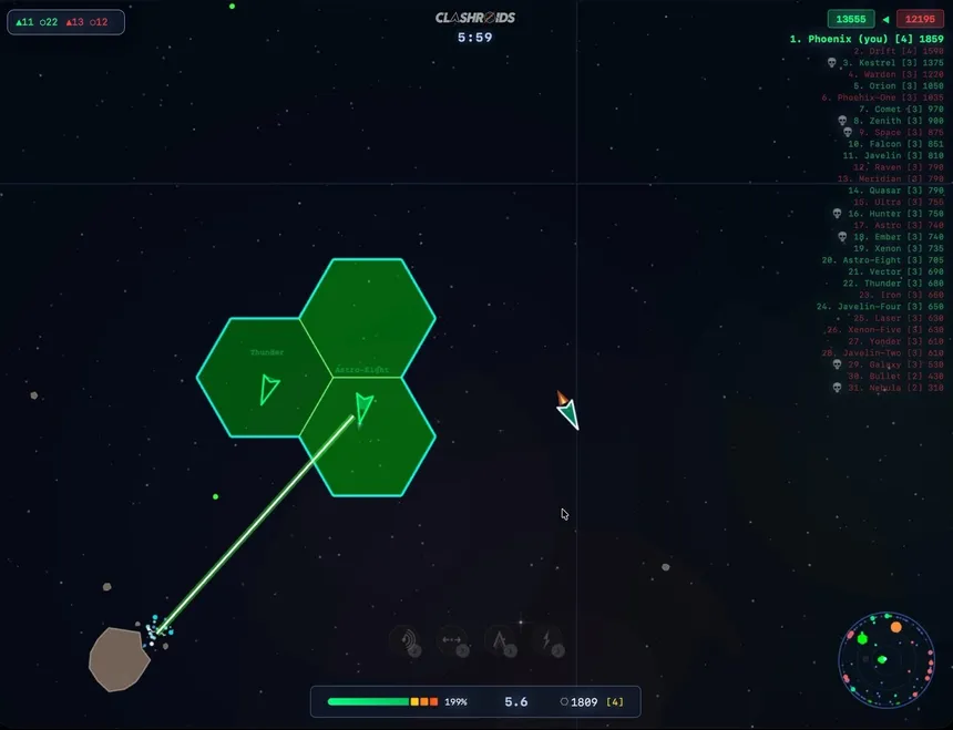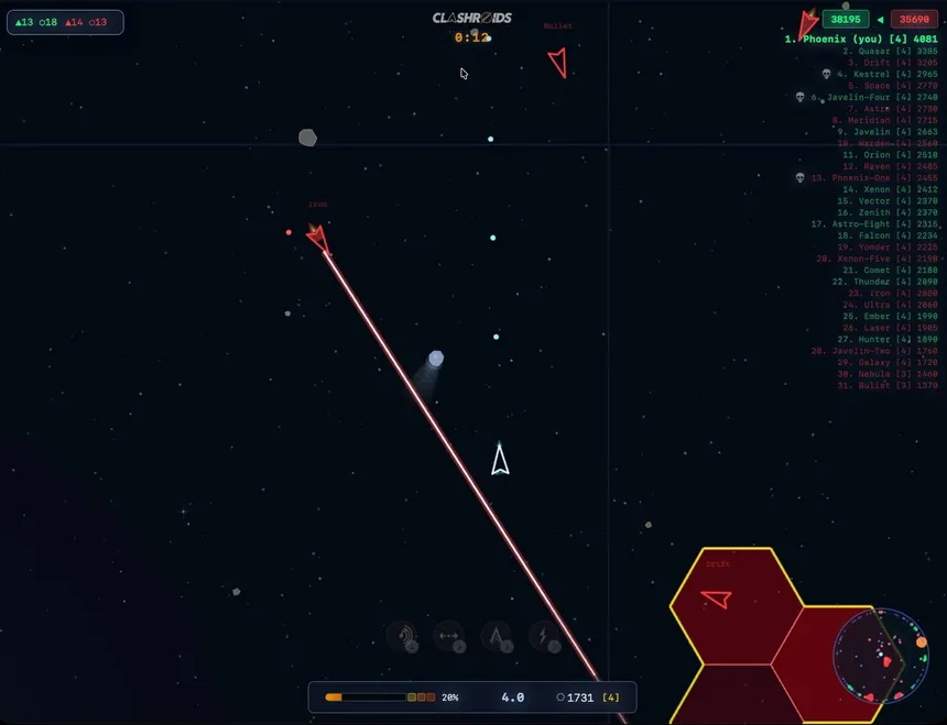 Massive multiplayer space combat meets arcade action. Battle up to 50 players in real time. Destroy asteroids for resources, build hex-based territory, open wormholes, and upgrade your ship to dominate the arena. The classic Asteroids formula, evolved into an online warzone.