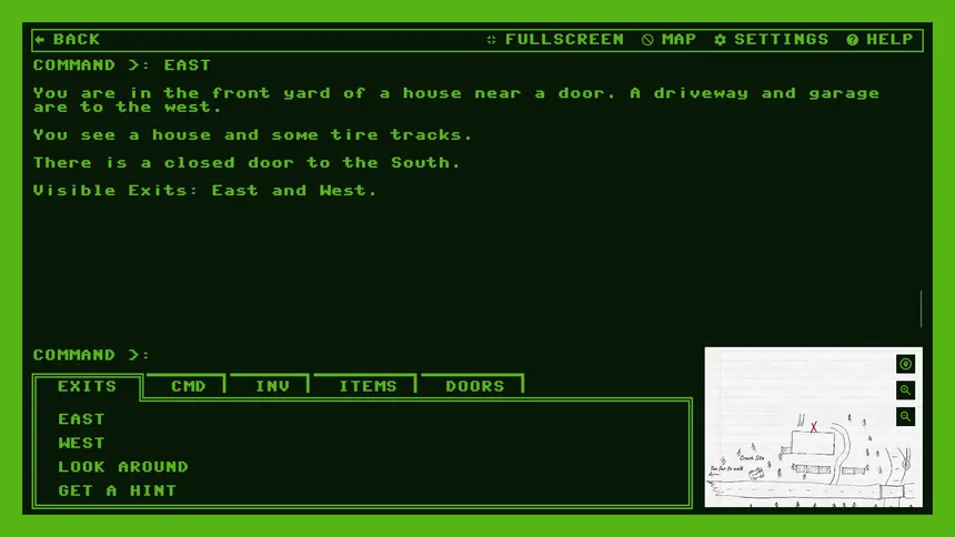 A classic-style text adventure game spanning three chapters. Enter verb/noun commands via keyboard, mouse, or game controller to explore, collect items, and solve puzzles in a post-apocalyptic, Christian-themed story. Features an auto-drawing map and hint system.