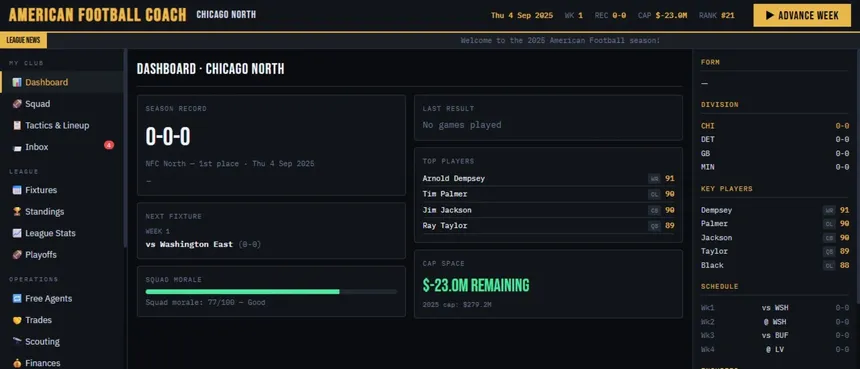 American Football Coach — игра от компании Andrew Ward, разработанная для платформы PC. Проект совмещает в себе такие жанры и элементы, как стратегия и rpg. Дополнительно игроки выделяют такие особенности игры, как спорт, стратегия, симулятор и киберспорт. Игра рассчитана на одиночное прохождение, многопользовательские режимы не предусмотрены.