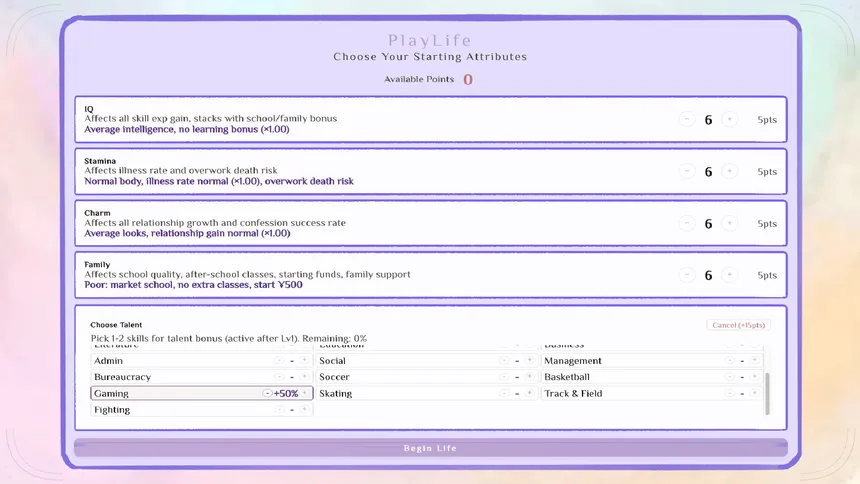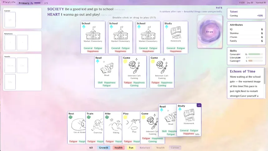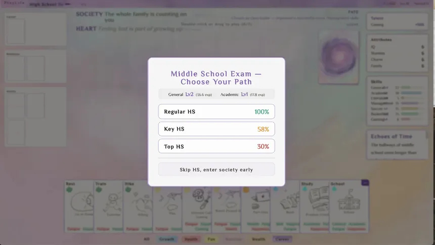A card-based life simulation where every choice is a card. Build your deck, shape your destiny, and explore multiple paths with 21 skills and 22 careers. Marry, stay single, get rich, or start over—every run tells a new life story.