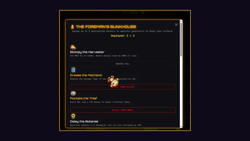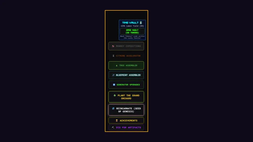 Grow an ultimate empire in LaVonne's Lemons Idle! Click your way from a single citrus to deep cosmic automation. Unearth ancient Artifacts, build out the Endless Research Lab, "feed" (click) your screen pet monkey, and prestige into the stars in this deeply strategic resource management clicker!