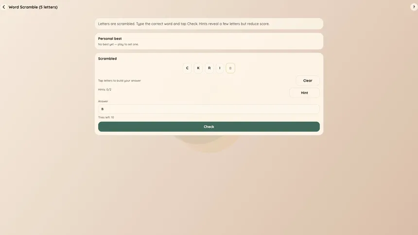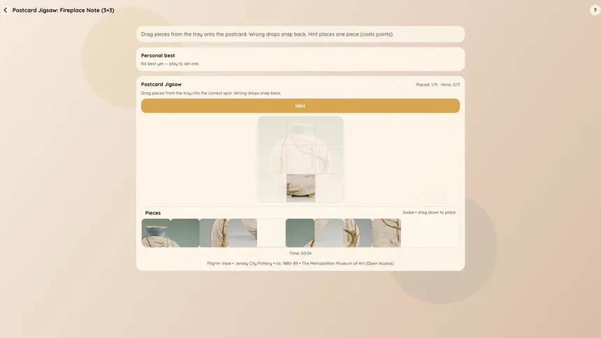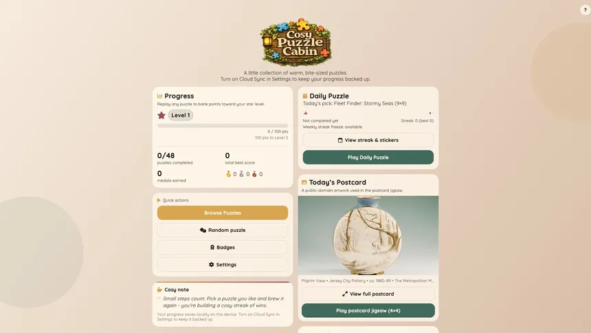 A cosy collection of 16 handcrafted puzzle types to unwind with. Logic, word, and pattern challenges — at your own pace, one puzzle at a time.