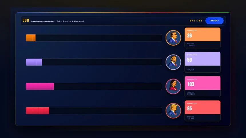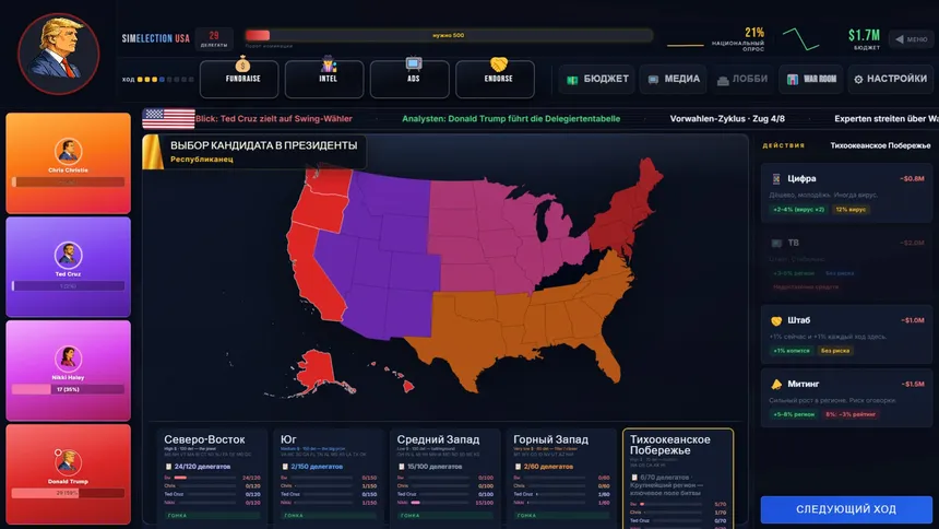 Управляйте президентской кампанией в этой пошаговой стратегии, контролируя финансы, медиа и влияние, чтобы выиграть выборы.