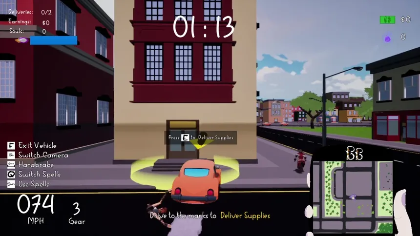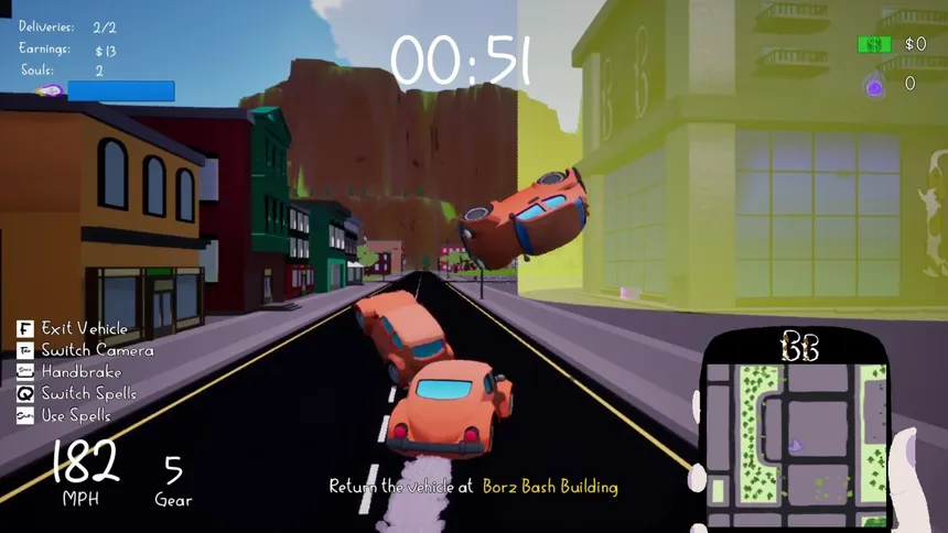A 3D physics-driven action racing game where players control a struggling necromancer at Borz Bash, the city's fastest-growing delivery service. Complete deliveries in set times to collect money and souls while exploring the city and causing chaos with devious magic spells.