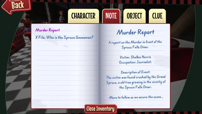 You're locked in a diner! But for a good reason. Someone chopped down the Grand Spruce, and the collateral damage is Big News. Figure out which of the many suspicious characters murdered the town's journalist by essentially bugging everybody.