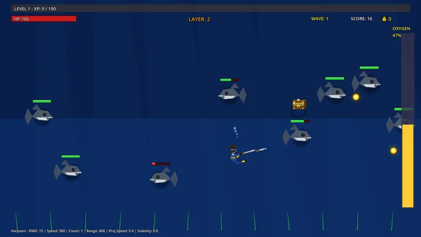 Deep Diver is an underwater roguelike survival action game where your oxygen is as dangerous as your enemies. Fight through endless waves, grow stronger, and decide when to surface, because every breath makes the game harder.