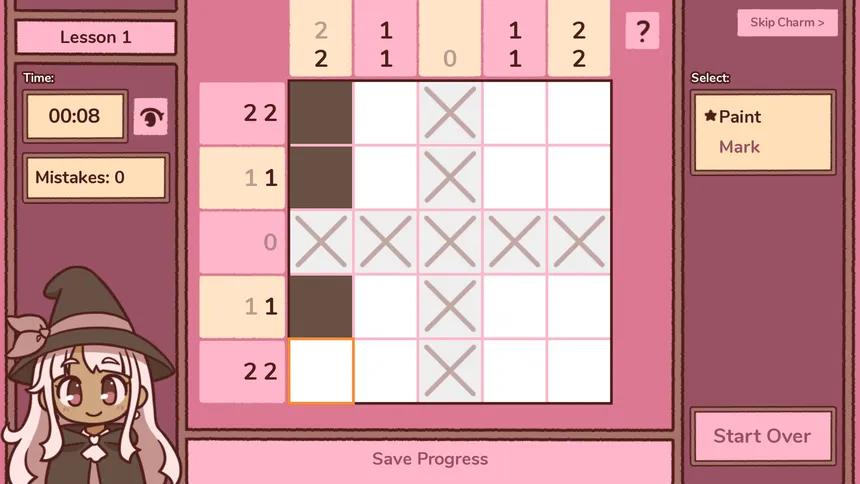Cassia is an airheaded young witch who's currently failing charms class... at this rate she won't be able to graduate! Study hard by completing nonogram puzzles, and maybe learn something about friendship along the way.
