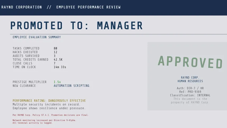 A cyberpunk incremental clicker where every click earns credits, every hack raises suspicion, and every promotion pulls you closer to Floor 13. Work by day. Hack by night. Remain at your desk.