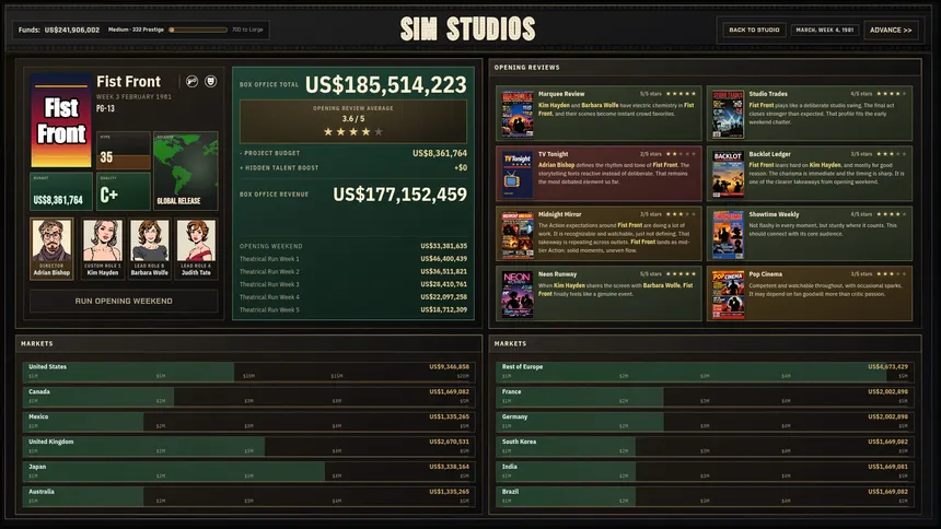 Build a film and television empire in a living entertainment industry beginning in the 1980s. Create and manage productions, cast unique talent, outmaneuver rival studios, climb the box office and grab television ratings in this deep tycoon-style management sim.