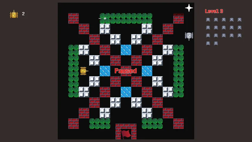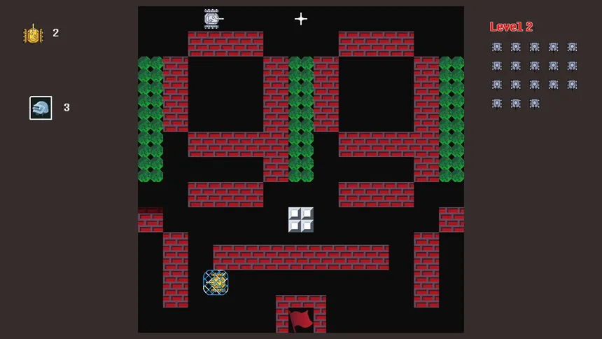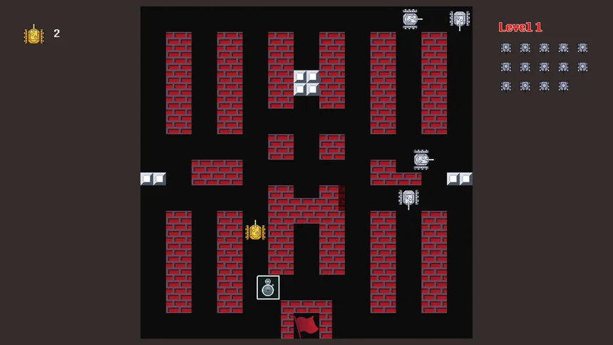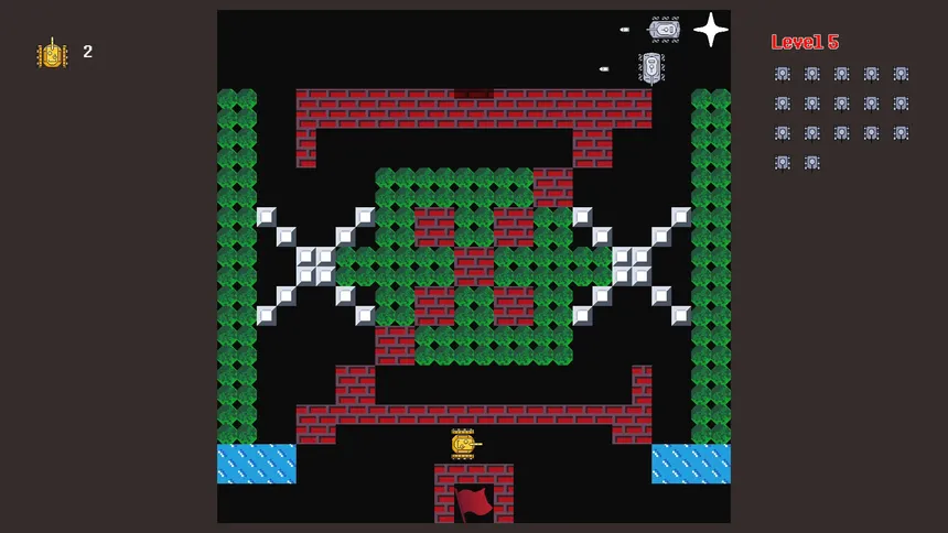 Players control tanks, navigating through varied terrains, defending their base from destruction while defeating all enemy tanks to achieve victory.