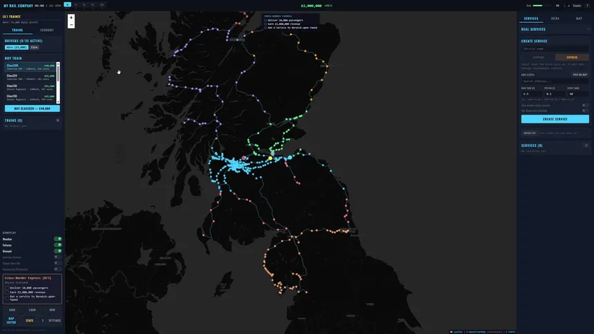 Build and manage your own railway empire. Buy trains, create services, lay track, and grow from a single branch line into a sprawling network. Map your own stations and routes, or play across the real UK rail network and beyond.