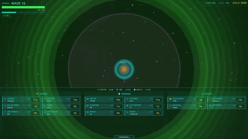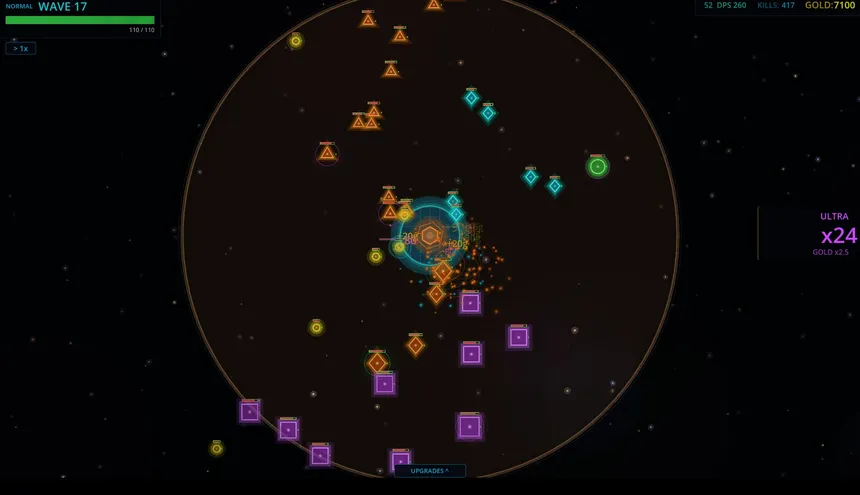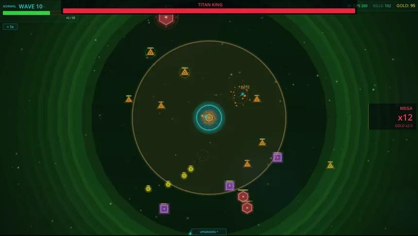 A minimalist roguelite tower defense with neon aesthetics. Defend your planet against infinite waves of geometric enemies. Buy 70 upgrades, activate abilities, chain combos and grow stronger between runs with permanent upgrades. Every attempt makes you stronger.