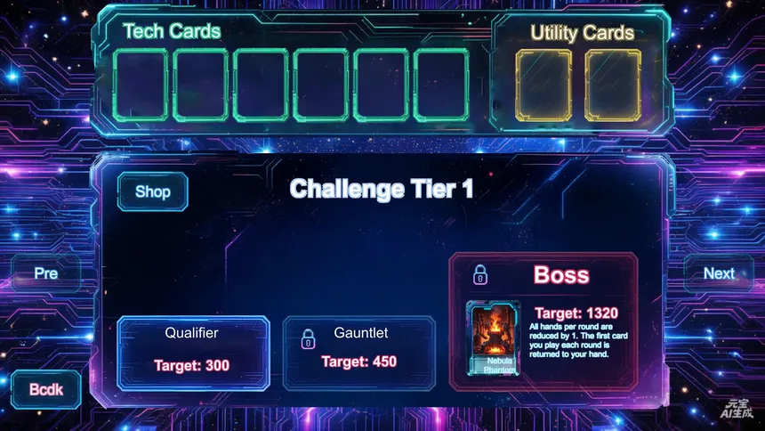 Cyber Pokeris a cyberpunk roguelike card strategy game. Use 150 Tech Cards (max 6) to combo-enhance poker hands (flushes, straights, etc.) & 36 Weapon Cards (max 3) to disrupt AI. Random shops/bosses/events. Conquer 8 levels (500–10k target pts), then Endless Mode. Master combos to win.