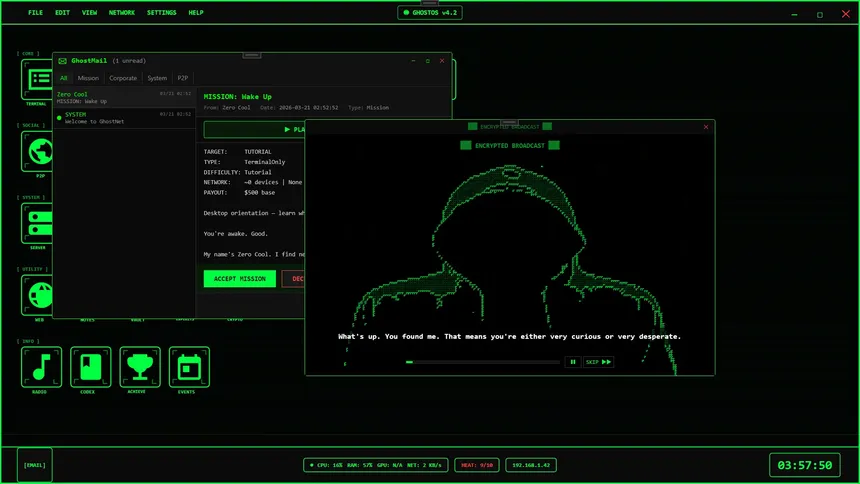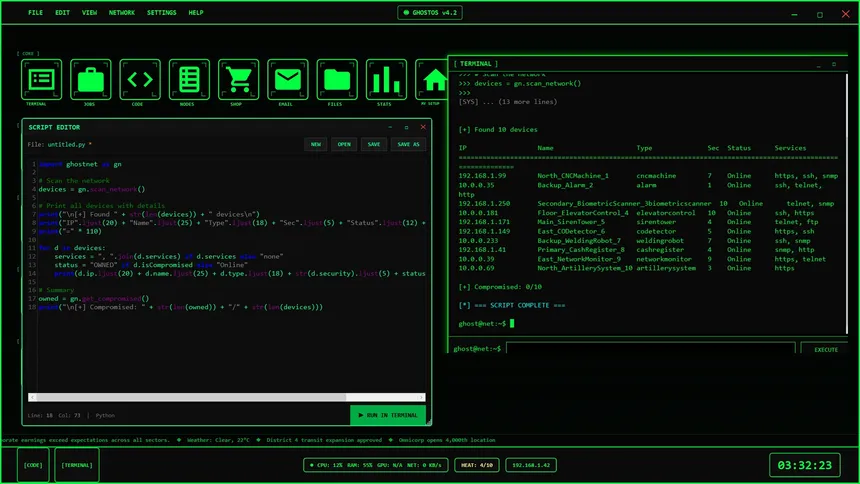 A cyberpunk hacking simulation where you hack from a fully simulated desktop OS. Write real Python scripts, crack corporate networks, support ground crews in real-time infiltrations, and uncover a conspiracy connecting every corporation in Neo-Tokyo.