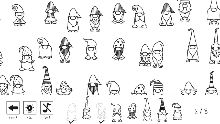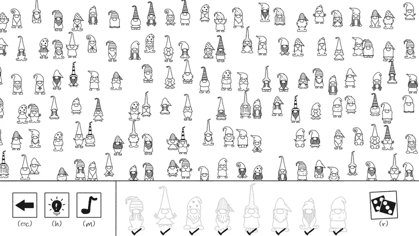 A simple hidden object game with hand-drawn art. Find specific gnomes in the large crowd. Gnome appearances and locations are randomized in every session, making the game replayable.