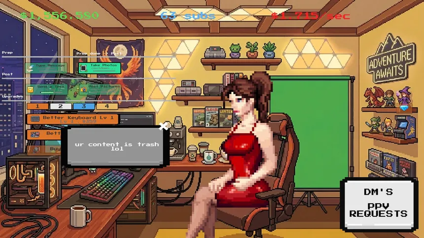 Rise to stardom in Spicy Content Creator! Manage your digital empire, engage fans with high-stakes PPV mini-games, and handle the heat of viral fame. Upgrade your production, automate your workflow, and prestige to unlock your ultimate spicy potential. Can you become the next big thing?