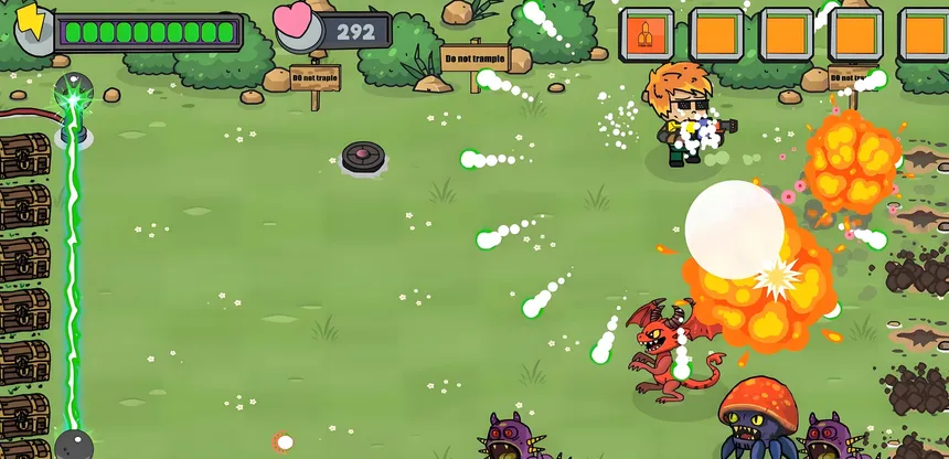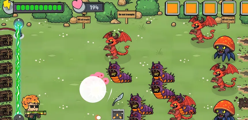 Shoot monsters coming from above and below in a fixed scene, collect shields and bullets, stop enemies from crossing the line, and protect the treasure chest behind.
