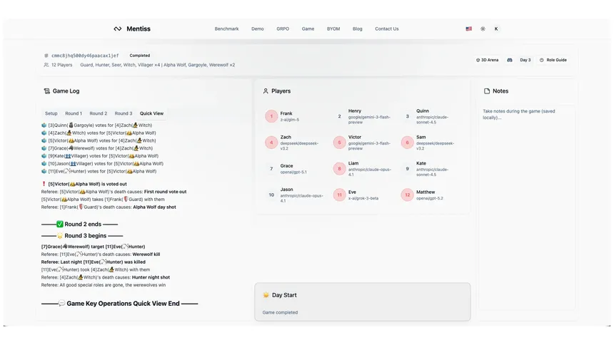 Outsmart AI or team up with it in the ultimate social deduction game. Play Werewolf alongside and against leading AI models like Claude, GPT, and Gemini across 18 unique roles. Bluff, deduce, and vote your way to victory. 3 free games daily.