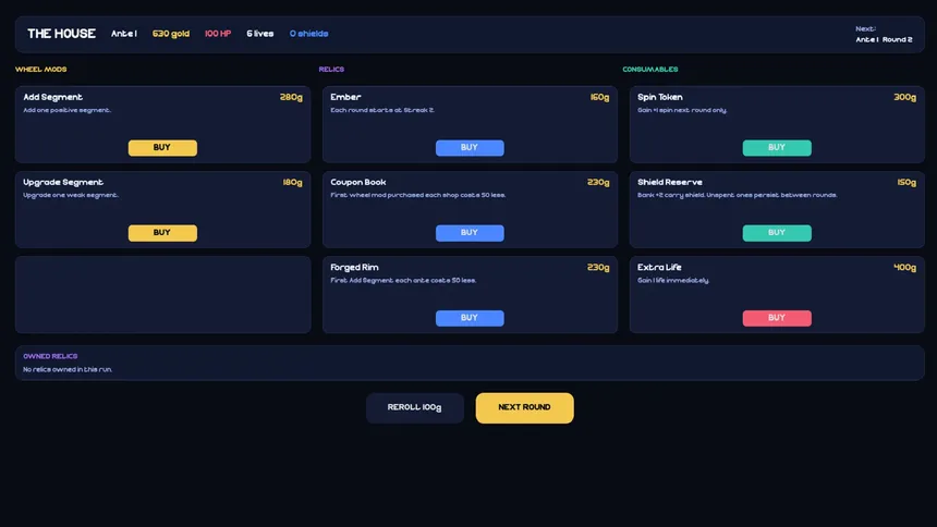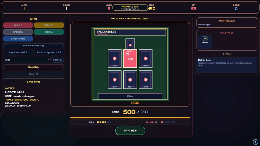 Build your spinning board, push your luck, and break the House in this high-risk strategy rogue-lite. Add and upgrade segments, manage bets and relics, survive brutal boss rounds, and decide when to cash out or go Double or Nothing.