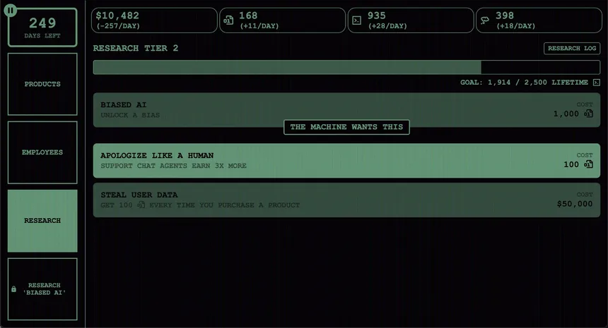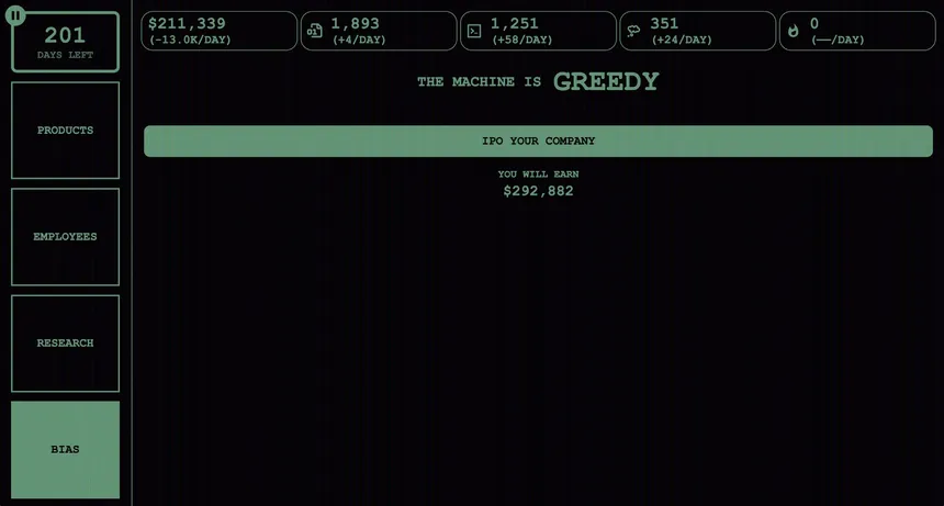 Make everyone obsolete with AI by managing resources on a Matrix-style interface. You have one year to strategize resource allocation, unlock new layers of growth, and keep an accelerating company from collapsing under its own scale.