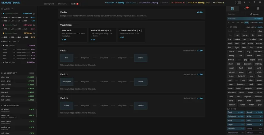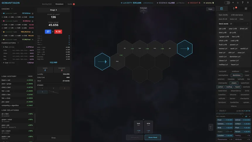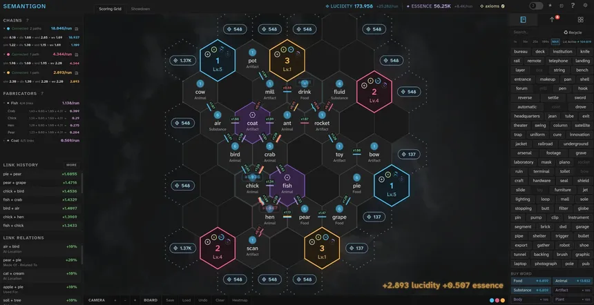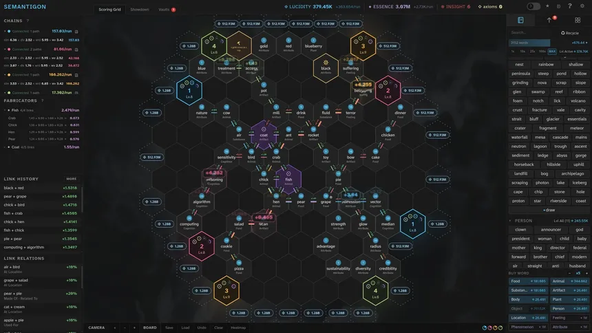 An idle game built on language. Place words on hex grids, link them into chains, and score based on how similar they are. Expand your grids, unlock modifiers, and uncover layers of systems that keep compounding your progress.