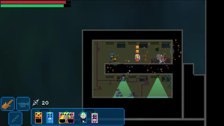 A noir metroidvania adventure in a mysterious Lost City spiced with souls-like gameplay systems. Multilayered 2D world design with intricate spatial depth. Equipable trumpets, guitar and guitar pedals.