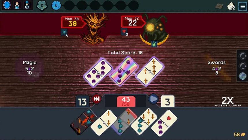 A roguelike deckbuilder about battling demons with a specialized deck of dominoes! Build your deck from over 3400 possible combinations of suits/pips and possible effects, and augment your run with powerful charms and discover diabolical synergies.