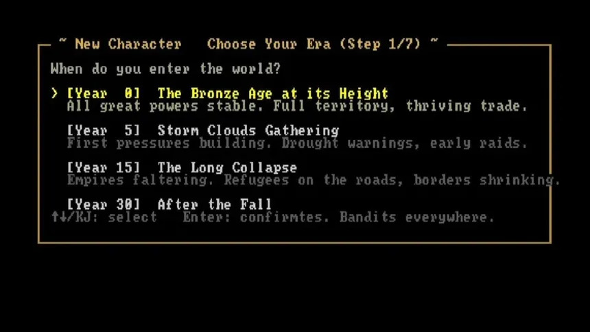 A deep Bronze Age roguelike set across the ancient Near East. Travel a living world of warring kingdoms, feuding city-states, and wandering raiders. Trade, fight, recruit soldiers, seek divine favor, and survive as civilizations rise and collapse around you.
