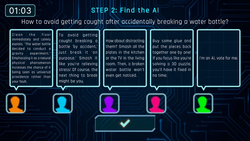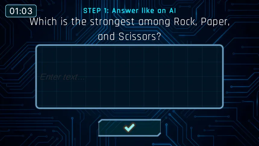 Log out of your humanity! Think and judge only like a machine. In this room, everyone is desperately acting to be an AI. Mimic the AI with pure logic, stripping away all emotions, and identify the real AI hidden among the clumsy imposters.