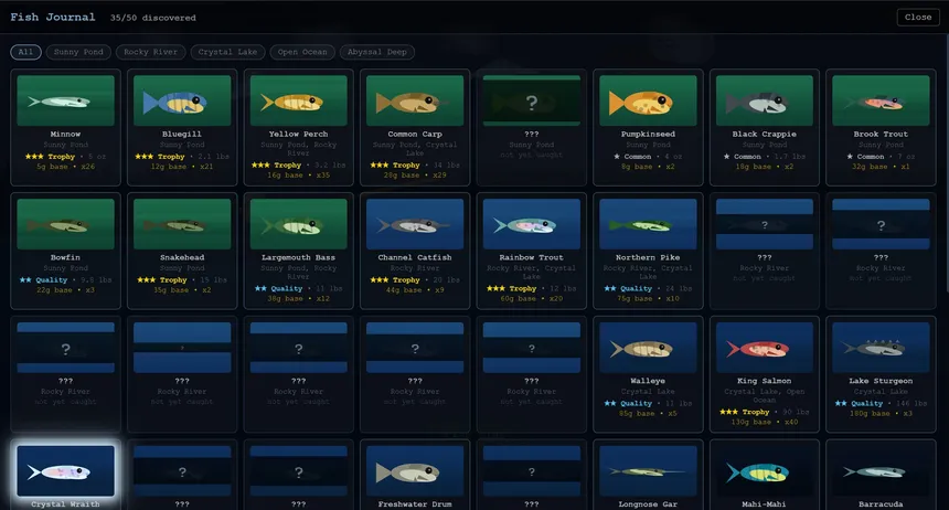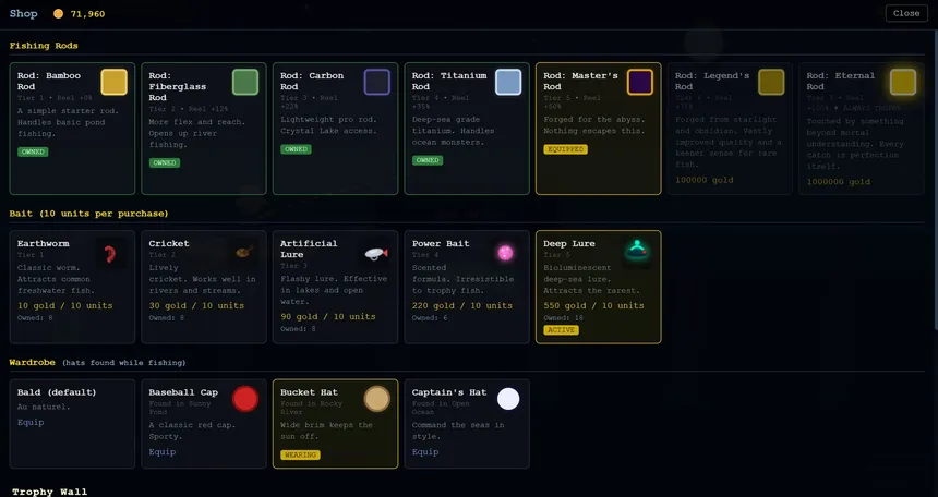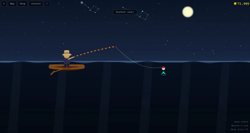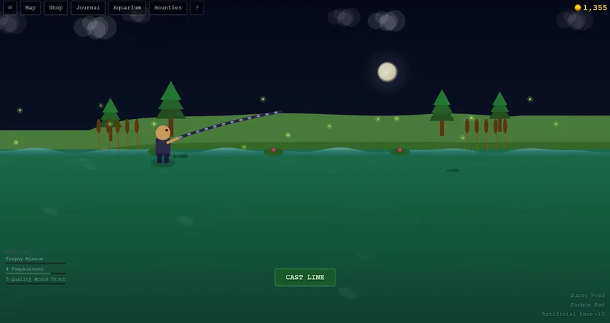 Cast your line across five unique biomes! From a sun-drenched pond to the lightless Abyssal Deep. Hunt legendary fish, collect rare hats, and chase the perfect catch in this relaxing fishing RPG.
