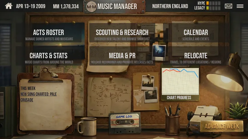 Машинный перевод. Основная игра в настоящее время доступна только на английском языке, но это будет пересмотрено, когда появится возможность. Управляйте артистами с 1952 по 2026 год: ищите таланты, выпускайте музыку и проходите через туры, тренды и фестивали.