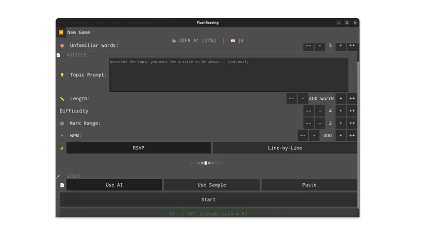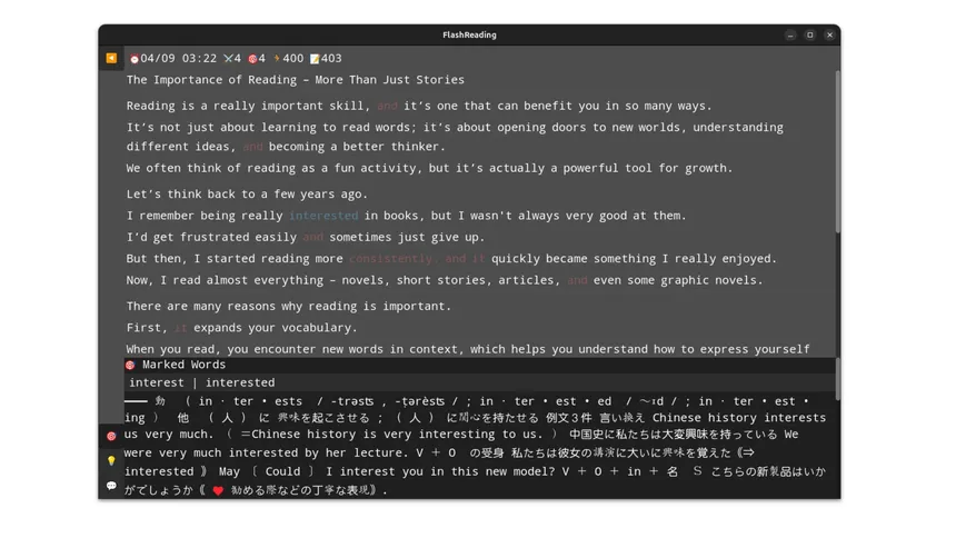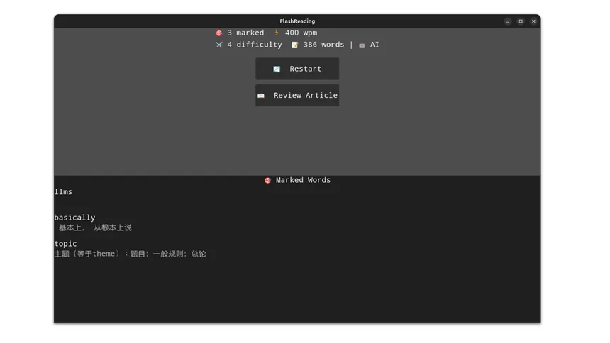 FlashReading показывает слова по одному (RSVP). Отмечайте незнакомые слова во время сессии. Система отслеживает словарный запас и автоматически настраивает ваши СВМ. ИИ генерирует статьи с вашими незнакомыми словами. Вы видите измеримый прогресс: более быстрое чтение, растущий словарный запас, результаты на основе данных.