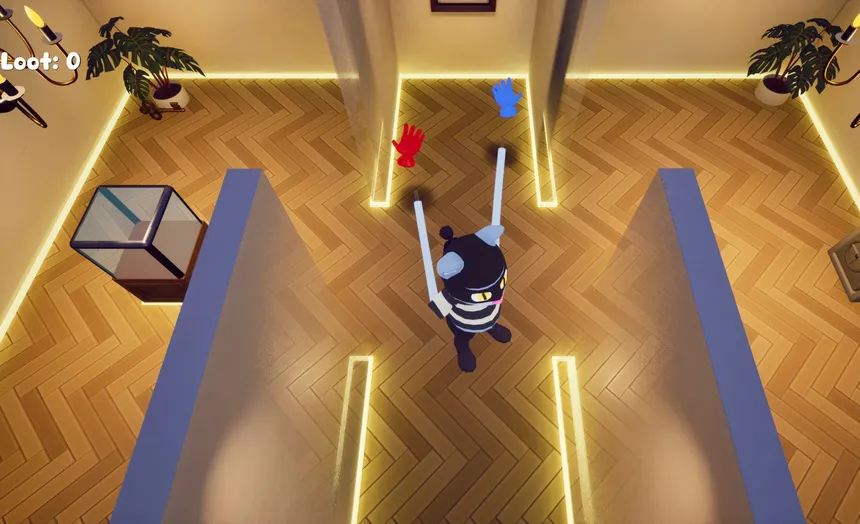 Sticky Fingers is a goofy couch-coop game where two players each control a single hand of a master thief. Work with your friend to avoid security, navigate traps, and steal as much loot as you can before fleeing the scene.