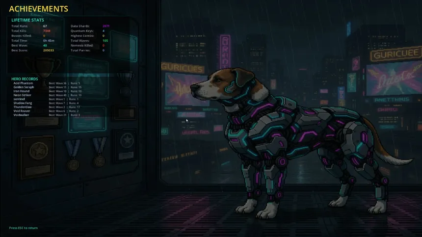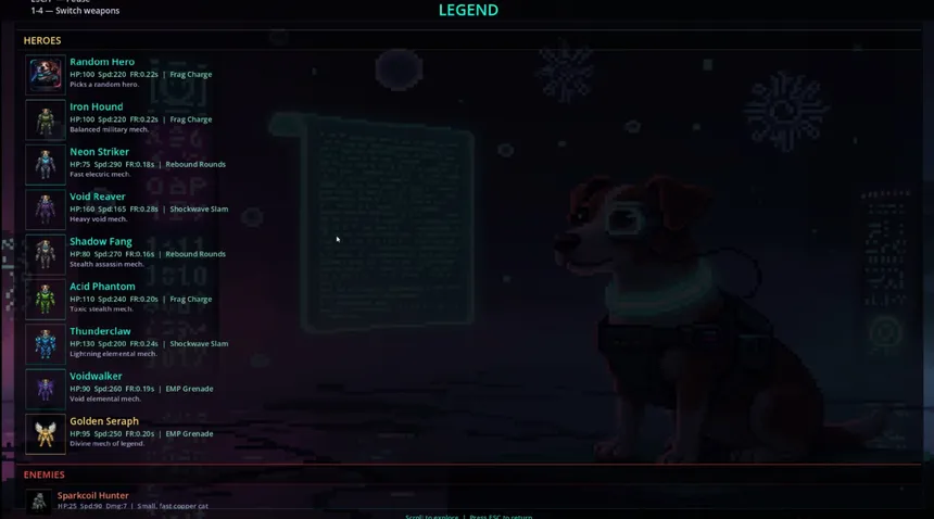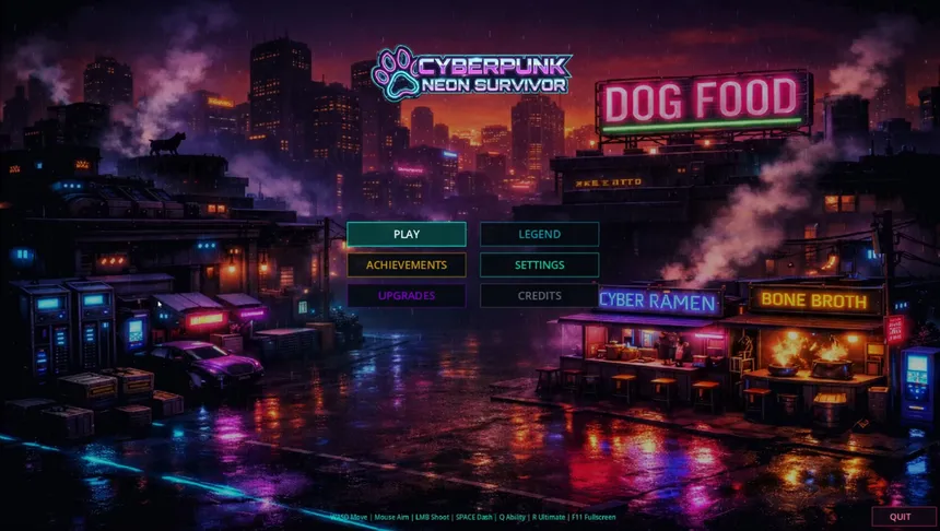 A top-down roguelike bullet-hell survivor where you pilot a cybernetic mech-dog against endless swarms of rogue cats. Dash, blast, and stack augments into game-breaking builds across 60 waves, persistent nemeses, and epic boss fights — then die, upgrade, and deploy again.