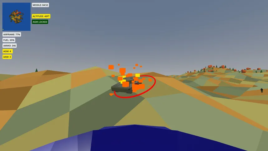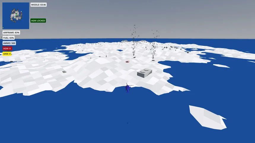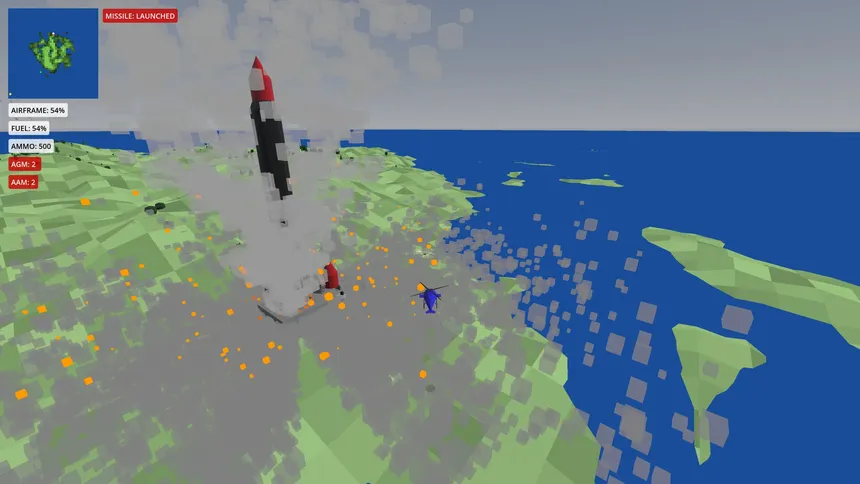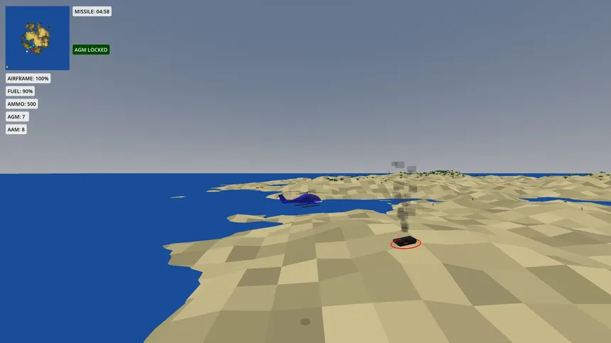 A helicopter combat game inspired by classic 16-bit titles. Destroy tanks, eliminate enemy forces, and rescue soldiers before an enemy missile launches. Manage fuel, ammunition, and altitude while engaging helicopters and avoiding AA launchers over procedurally generated terrain.
