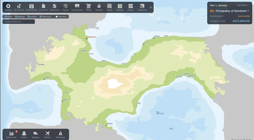 A sandbox strategy game. Build your nation's transport network, grow your economy, and raise your people's prosperity. Every map is procedurally generated and unique.